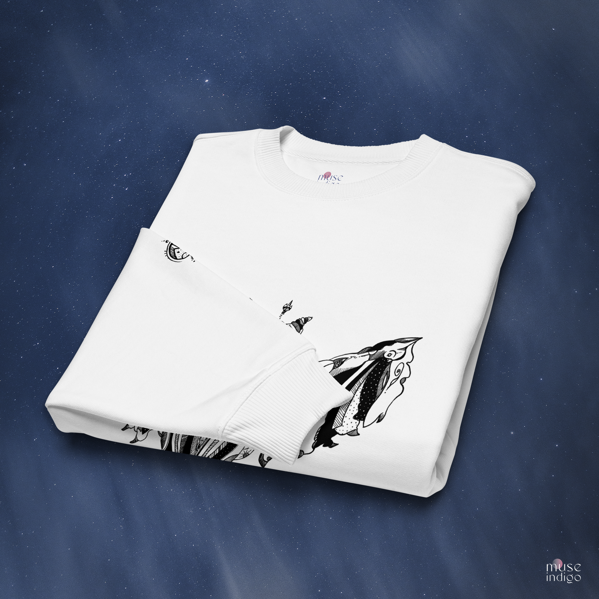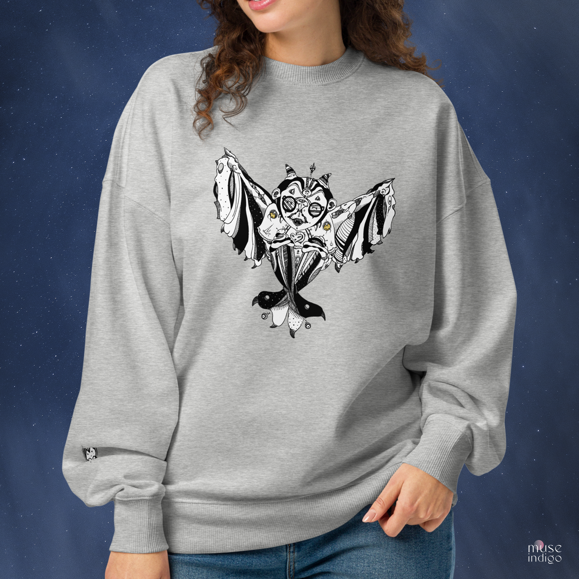 Twilight Snuggle takes center stage on the chest, wings wide and ready for stardust. Her tiny companion perches quietly on your left sleeve, a secret friend only fellow misfits will notice.